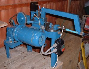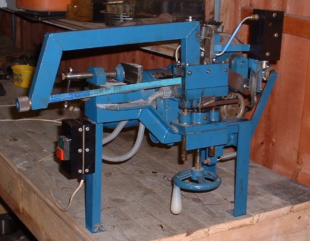 This was bought off Ebay some time ago for a very reasonable price with the intention of using it to cut up larger sections of metal such as those that came in the Kennet kit. It appears to be home made to an unknown design but is a very nice piece of work. It uses a commercial motor and reduction unit driving the usual reciprocating arm. It uses standard 12 inch blades although only half the blade actually cuts. It features a very ingenious automatic feed mechanism which gradually lowers the blade as it cuts through the metal and then stops the motor when the cut is complete. The intention was to mount it on the wooden bench as shown but a trial run showed that the bench was not rigid enough and rocked alarmingly when the saw was cutting so so far it has been used standing on the floor. It needs securing somehow though as it tends to waltz around the floor on it's own! It was used recently to cut up a length of 2" x 1" steel bar into 8 pieces which it did with no problem although it did take about 20 minutes per cut. Back to Equipment